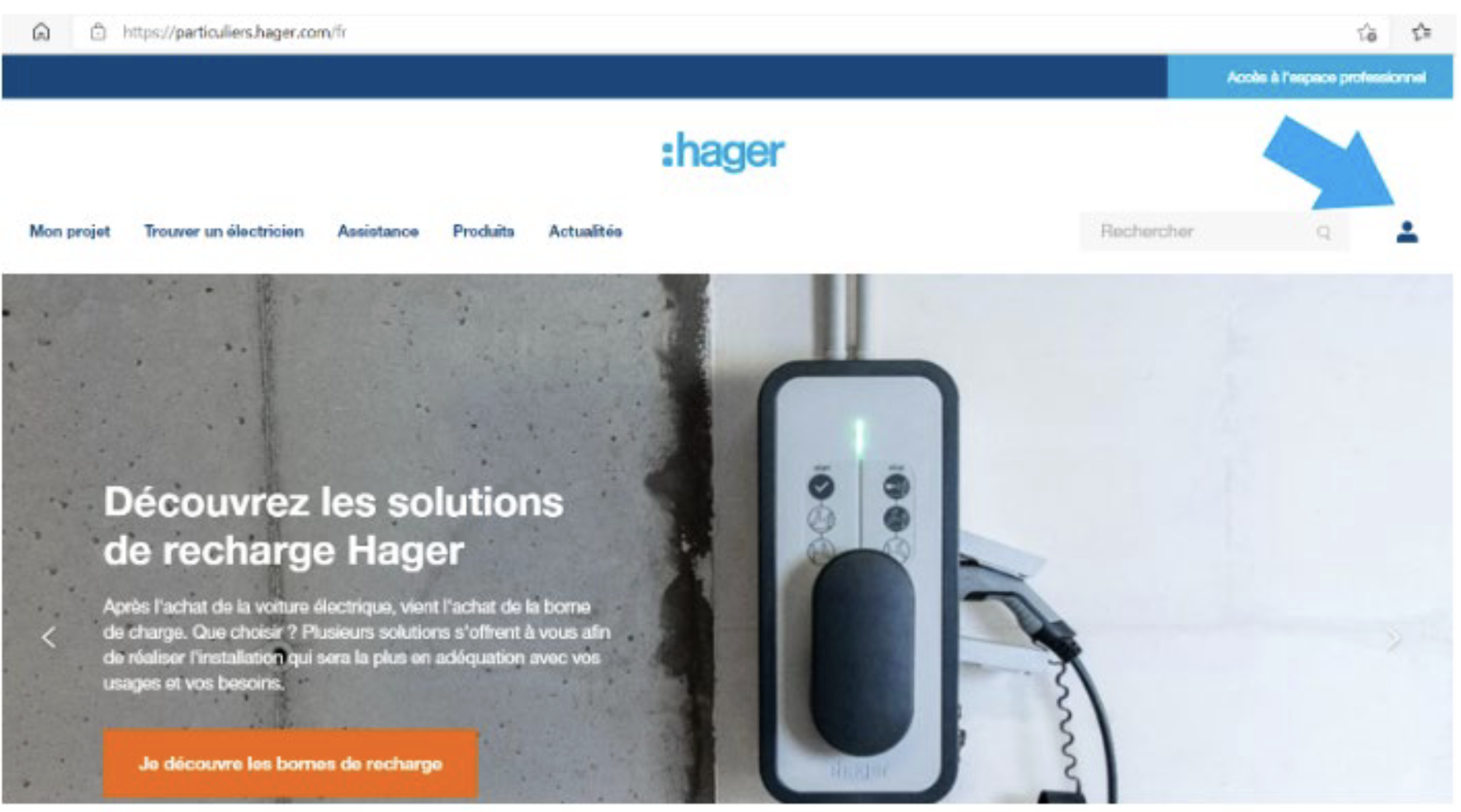 Après avoir ouvert le site web de Hager, cliquez sur l'icône qui affiche à droite de la page pour arriver à votre compte.